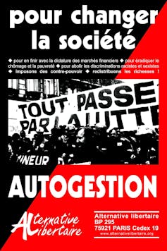 Photo d’une manifestation de mineurs dans les années 1990. Affiche d’Alternative libertaire (AL), 2000. Alternative libertaire/Wikimedia, CC BY-NC-ND