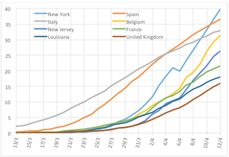 On observe que l’Espagne a dépassé l’Italie dès le 4 avril et le New Jersey la France depuis le 8 avril. Le 11 avril, l’État de New York est devenu le territoire le plus atteint, passant devant l’Espagne.