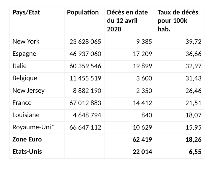 Le 12 avril, l’État de New York, dont la population est le double de celle de la Belgique, a présenté le taux de décès pour 100 000 habitants le plus élevé au monde, bien supérieur à celui de l’Italie, le premier pays occidental à avoir été massivement touché par le virus. À la même date, l’État du New Jersey dépasse nettement la France, elle-même suivie de la Louisiane. Au niveau fédéral, les États-Unis présentent un taux de décès pour 100 000 habitants de 6,55, bien plus faible que la zone euro (18,26 décès pour 100 000 habitants).