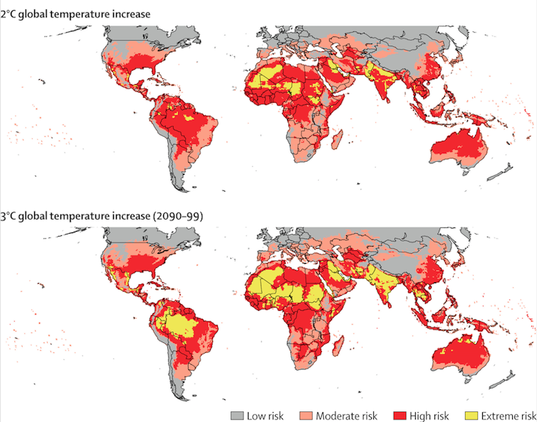 Comme on peut s’y attendre, les régions les plus concernées sont les régions tropicales (voir la carte ci-dessous). En plus du risque sanitaire, la réduction de la capacité de travail des personnes exposées est susceptible d’avoir également des effets économiques, en réduisant les revenus de travailleur·euse·s, et ainsi augmenter le risque de paupérisation.