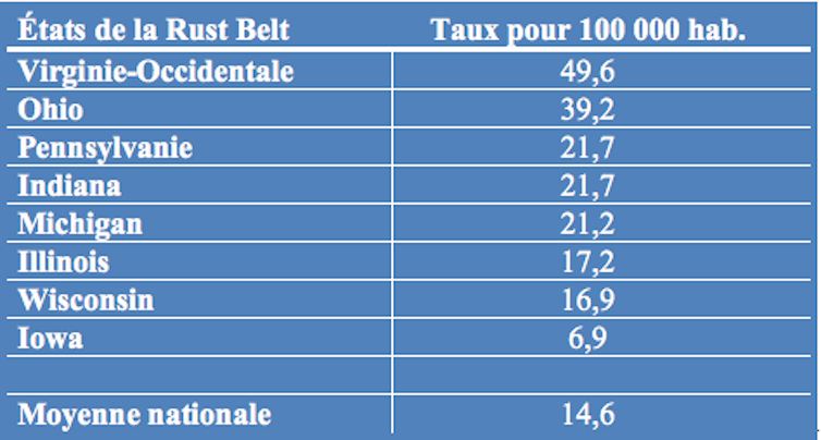 Selon les données du NIDA (National Institute on Drug Abuse), qui remontent à 2017, le taux de mortalité aux opioïdes pour 100 000 habitants est, à l’exception de l’Iowa, largement supérieur à la moyenne nationale dans tous les États qui constituent la Rust Belt (voir tableau 1), la Virginie-Occidentale et l’Ohio étant les États américains où la mortalité est la plus importante.