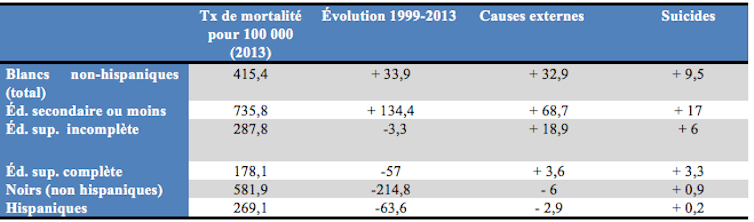 En croisant l’évolution de la mortalité avec le niveau éducatif, on constate que celle-ci est concentrée au sein de la population blanche ayant le plus faible niveau scolaire. Si le taux de mortalité est en augmentation de plus de 33 % dans la population blanche en général, il croît de plus de 134 % chez ceux ne disposant que d’un niveau d’éducation secondaire ou moindre (voir tableau 2). Entre 2014 et 2016, l’espérance de vie globale aux États-Unis a baissé de 78,9 ans à 78,7 ans.