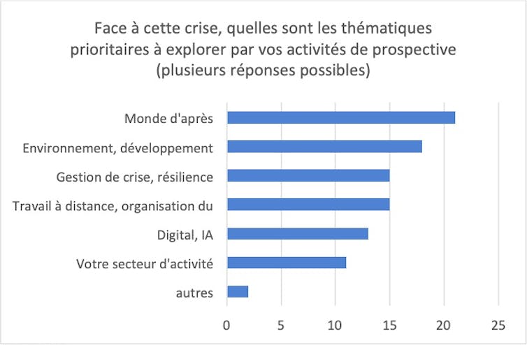 Nous avons en outre demandé aux personnes interrogées dans le cadre de cette enquête quels sujets d’exploration des avenirs possibles les occuperont dans les prochains mois… C’est « le monde d’après » qui occupe la première place. En effet, comme le souligne un répondant :
