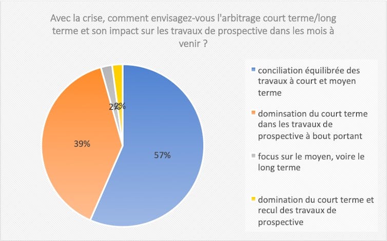Pour 57 % des personnes interrogées, il s’agira demain de trouver un équilibre entre travaux de court terme et de moyen terme. Préserver la réflexion à long terme sera un défi dans cette crise qui dure, et d’ailleurs, 39 % de responsables pensent que c’est la prospective à bout portant qui dominera dans les mois qui viennent.